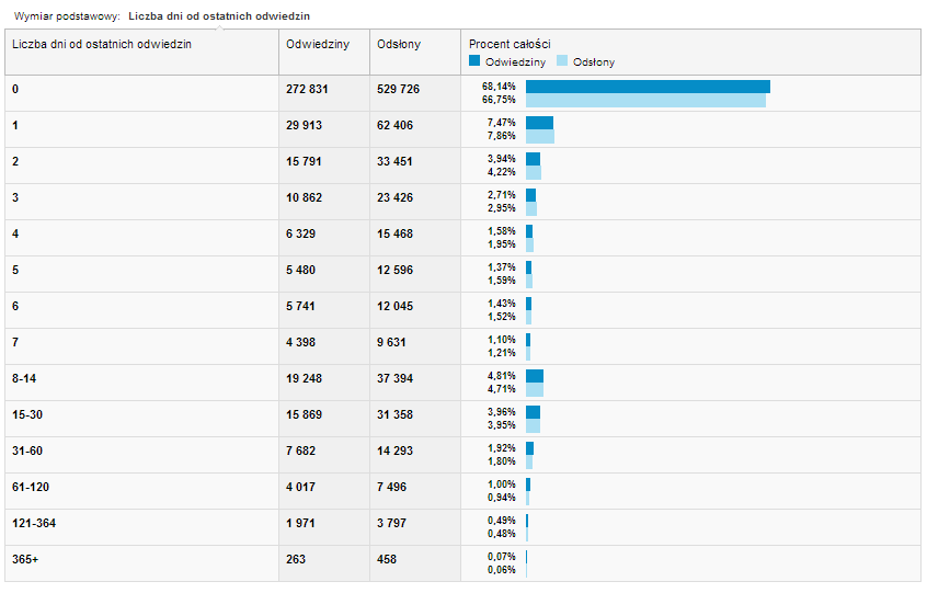 Drugą stroną tego samego medalu jest wspomniana powyżej Liczba dni od ostatnich odwiedzin, czyli drugi z dostępnych wykresów. Tym razem grupuje on użytkowników w grupy w zależności od tego, jak szybko odwiedzili nasz serwis – po jednym dniu, po dwóch, trzech, a może po 30 czy 60. Zależy nam na tym, aby udział wierszy z wartościami 1 dzień czy 2 dni był jak największy, a udział wierszy z długimi odstępami między kolejnymi wizytami jak najmniejszy.