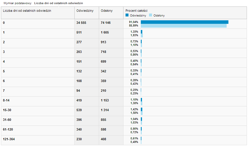 Trzeba tutaj tylko wyjaśnić pewien niuans. Uwagę zwraca bardzo wysoki odsetek użytkowników, którzy wracają w dniu “0”, czyli teoretycznie wielokrotnie w ciągu tego samego dnia odwiedzają przykładowy serwis. Wynika to jednak z faktu, że Google Analytics w tym wierszu zlicza też wszystkich nowych użytkowników, którzy serwis odwiedzali po raz pierwszy. W serwisie z powyższego zrzutu użytkownicy nowi stanowią 82%, a powracający 18%. Powracający w dniu “0” to zatem tylko różnica między 91% z wykresu a 82%, czyli 9%.