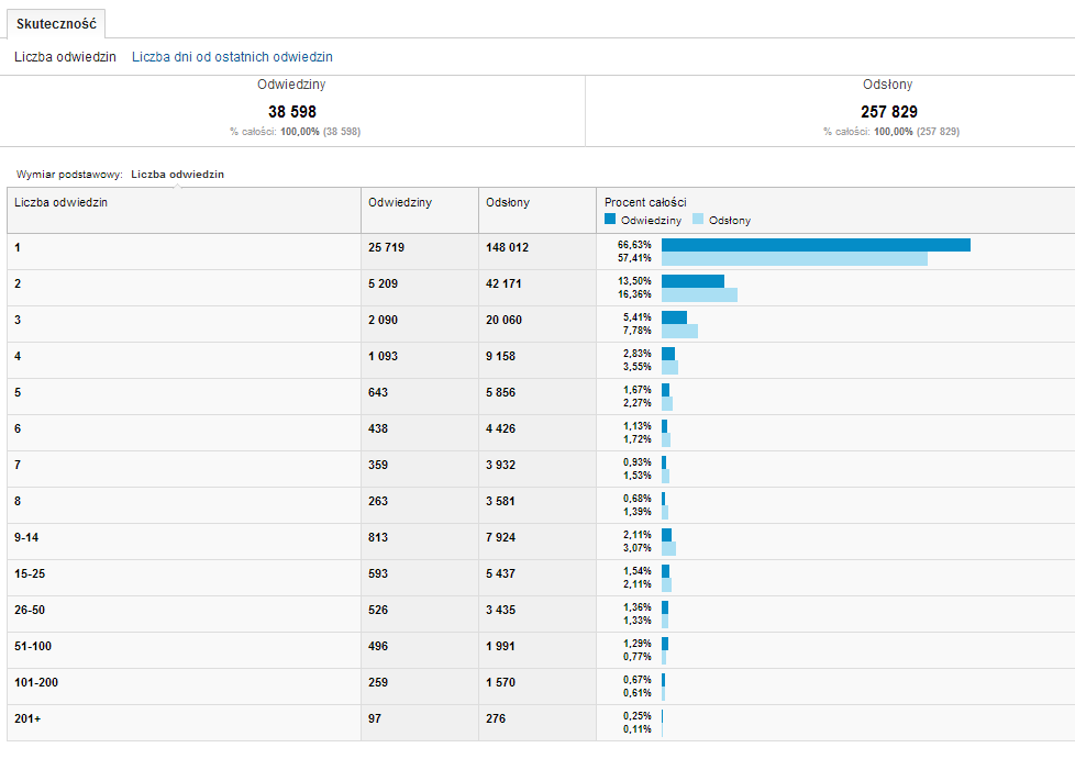 Liczba odwiedzin grupuje użytkowników w grupy tych, którzy nasz serwis odwiedzili raz, dwa razy, trzy… przy czym później stosowane są przedziały typu 9-14 odwiedzin, 15-25, aż do 201+.