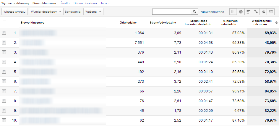 Na szczęście Google jakiś czas temu wprowadziło bardzo przydatny mechanizm sortowania ważonego. Gdy przełączymy tryb sortowania z domyślnego na ważone, a następnie posortujemy tabelę wg współczynnika odrzuceń, zobaczymy dokładnie to, czego szukamy: słowa (frazy) kluczowe z dużym ruchem i wysokim współczynnikiem odrzuceń.