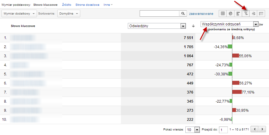 Jednym z nich jest przełączenie widoku ze zwykłej tabeli na Porównanie i wybranie współczynnika odrzuceń jako porównywanej wartości. Teraz już wystarczy zwiększyć domyślną liczbę wierszy z 10 np. na 250 lub 500, aby zobaczyć przy każdej frazie ładny wykres, pokazujący, o ile współczynnik odrzuceń jest dla niej mniejszy lub większy niż średnia dla całego serwisu. Dzięki graficznej prezentacji danych, widok ten pozwala błyskawicznie wychwycić słowa, dla których współczynnik odrzuceń jest znacząco gorszy od średniej.