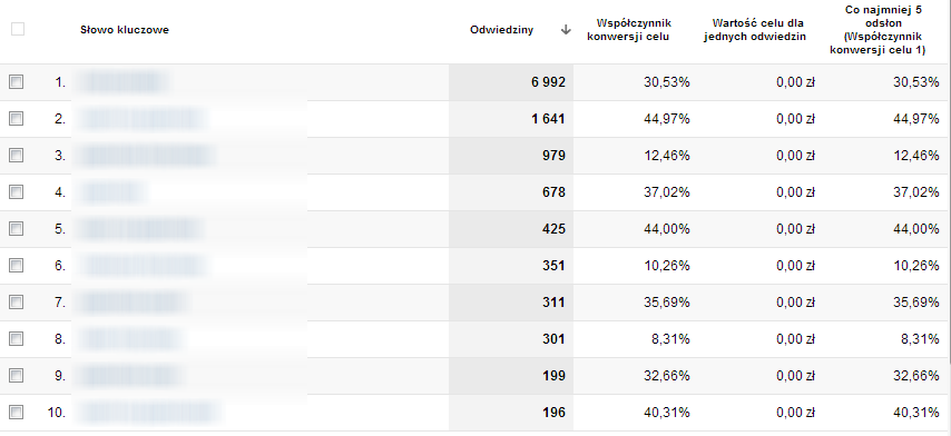 Widać jak na dłoni, że niektóre frazy sprawdzają się znakomicie w realizacji tego celu (współczynnik konwersji na poziomie 30-45%), podczas gdy inne, o porównywalnej liczbie wizyt, wypadają zdecydowanie gorzej (wynik 8-10%). Jest to punkt wyjścia do dalszych analiz i optymalizacji prowadzonych działań.