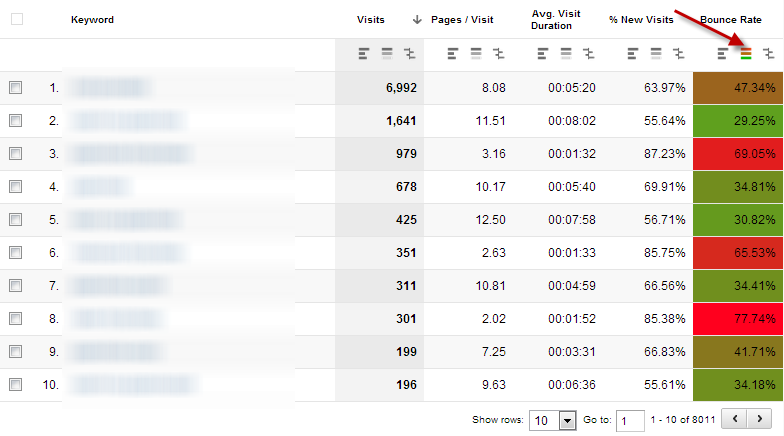 Ostatnią kolumną w tabeli będzie współczynnik odrzuceń. Jednakże najprostsza próba posortowania wg wartości w tej kolumnie nie da sensownych wyników, ponieważ zobaczymy wtedy słowa kluczowe, dla których współczynnik odrzuceń wynosi 100%, ale liczba odwiedzin jest bardzo znikoma. Jakiekolwiek poprawki w przypadku tych słów nie będą prawdopodobnie warte poświęconego na to czasu.